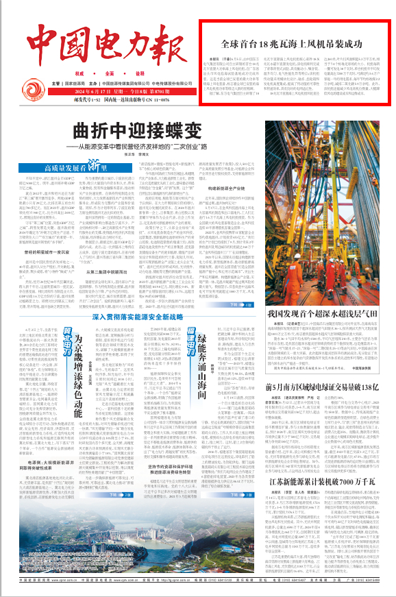 [中國電力報]全球首臺18兆瓦海上風機吊裝成功